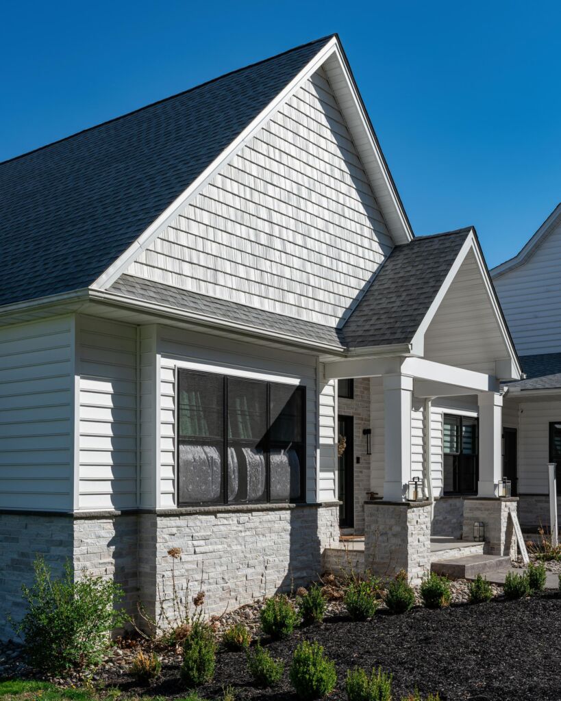 The front entry is the focal point of the design. The entire gable face is clad in Everest Standard Cut, framing black double doors beneath a covered porch. A pendant lantern mounted against the stone adds depth and shadow, while crisp white trim reinforces the clean geometry typical of modern farmhouse architecture.